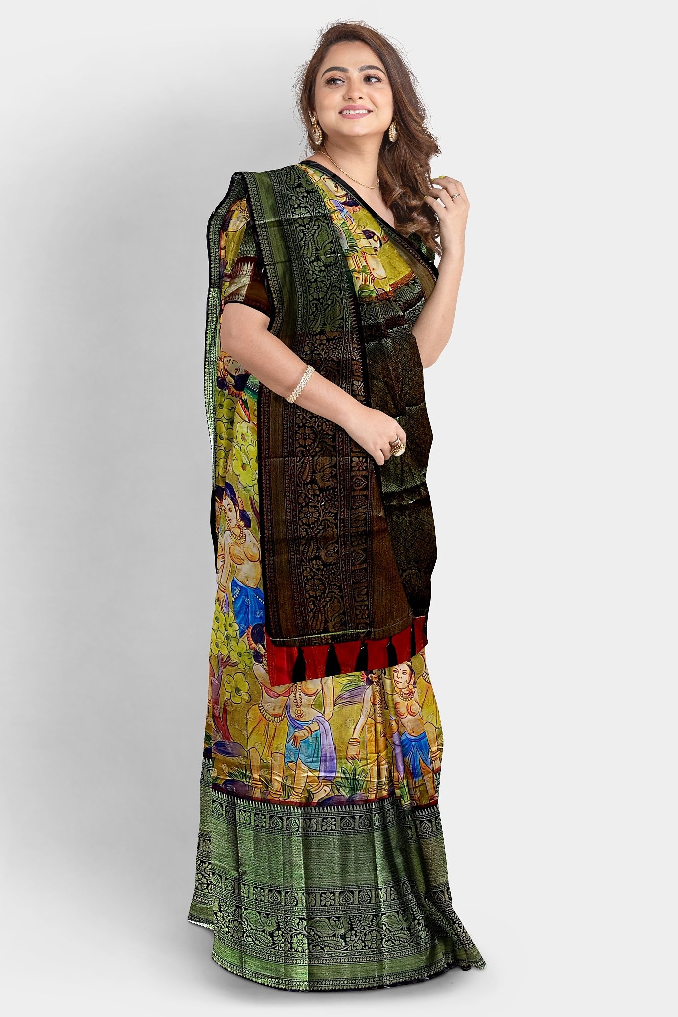 The Image gives a detailed look of the Saree and actual blouse piece that comes with this saree. The blouse used by the model in the pictures is only for styling purpose.